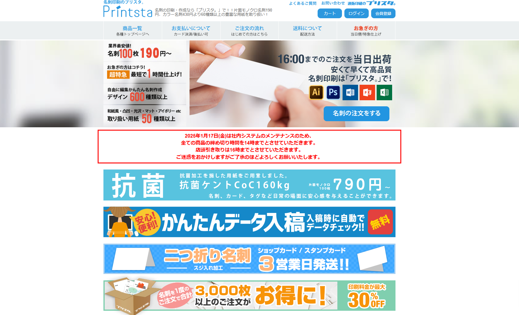 【PR】プリスタ。 詳細はこちらをクリック 【プリスタ。では豊富な用紙で高品質な名刺印刷・作成が可能です!!】 ♦プリスタ。オススメポイント♦●最短当日発送可能!●大阪市内であれば当日中のお届けも可能!●豊富な用紙で高品質で名刺印刷・作成が可能!お仕事や趣味など!自分の理想の名刺が作れちゃう…かも! 商材名 プリスタ。運営者 (H.I)※当サイトはアフィリエイトプログラムを利用し宣伝目的で作成しております。